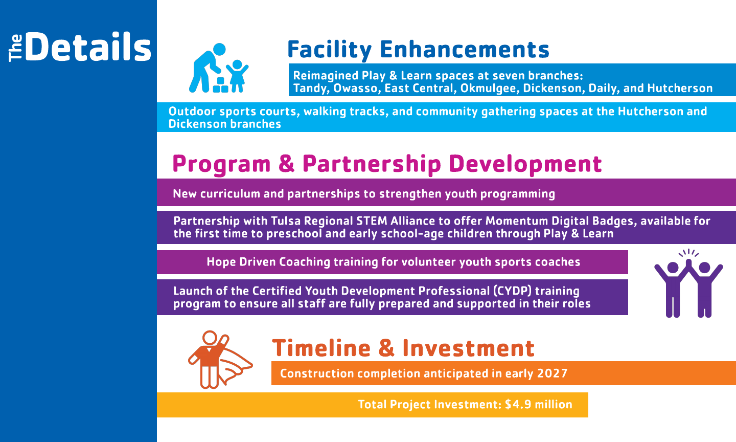 As part of our commitment to thoughtful planning and strong branch operations, the Operations Committee of the YMCA of Greater Tulsa Board of Directors received presentations from branch leadership throughout 2024 and 2025 highlighting opportunities to strengthen branch performance and community impact. Notably, each project submitted for consideration directly aligned with the YMCA’s strategic priority of Youth Development. Program prioritization was guided by a comprehensive evaluation matrix grounded in our strategic plan, financial sustainability, and the evolving needs of the communities we serve.